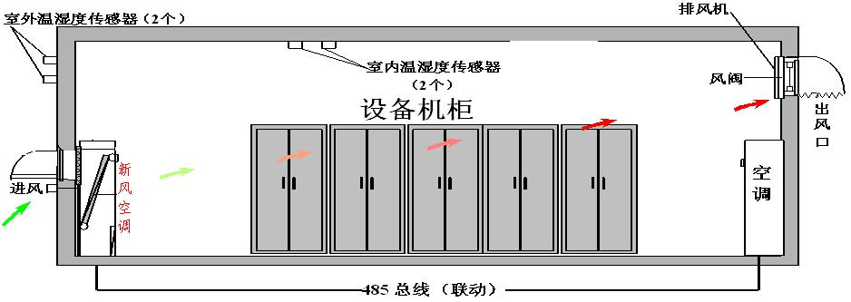 5)模塊新風具備應急功能,當機房內空調異常退服時,模塊新風根據自身設定的溫度值,啟動換風,為機房提供自然冷源,確保室內外溫度差小魚3℃,切