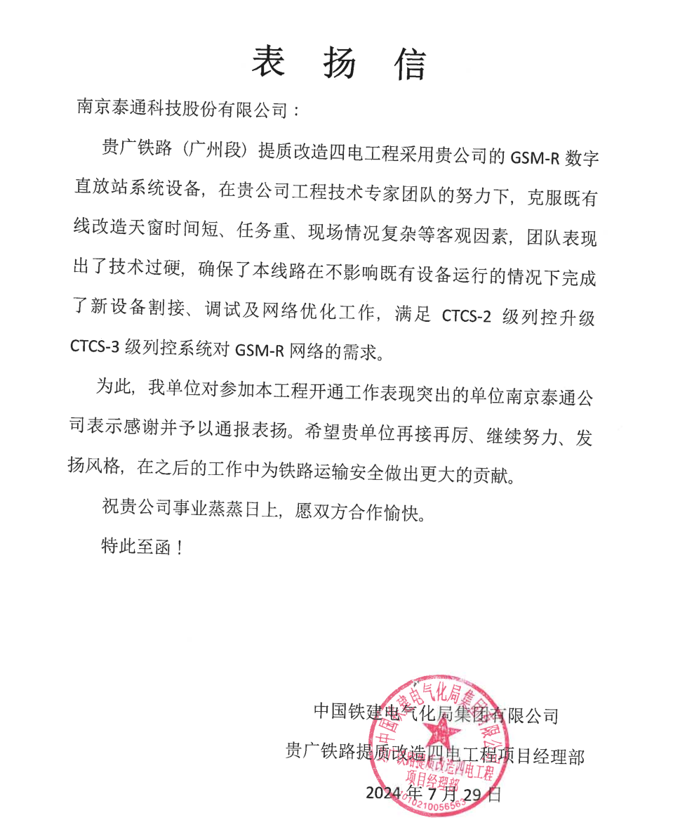 近日,泰通科技收到中國鐵建電氣化局集團有限公司發來的表揚信。信中對公司在貴廣鐵路(廣州段)提質改造四電工程中出色的專業能力和高效的團隊協作表達了感謝,同時希望泰通科技再接再厲,在之后的工作中為鐵路運輸安全做出更大貢獻。